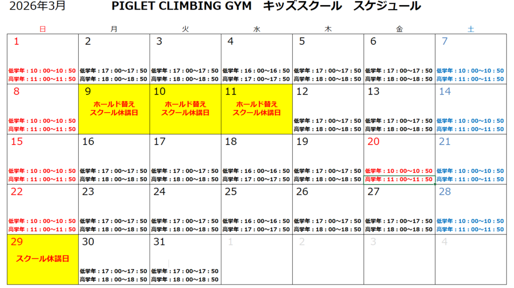 9日(月)・10日(火)・11日(水)はホールド替えの為、29日(日)は5週目の為、スクールはお休みです。